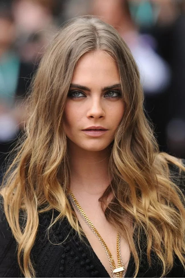 Cara Delevingne’s dirty blonde locks transition from dark and ashy at the roots with slightly warmer ends. Thanks to her medium skin tone, both colours work with her complexion. If you’re trying to get this look yourself, make sure the shade that’s next to your face is the one that looks best with your skin tone.