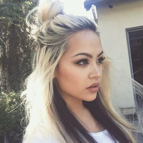 If you want to put your long blonde hair half up in a laid-back style that can still grab attention, try this fishtail style french braid to pull bangs away from the face, and secure in a messy top knot.