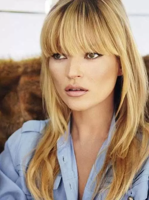 This style features multidimensional colour in several warm blonde shades, making it look natural and girl-next-door, especially when paired with these big bangs.
