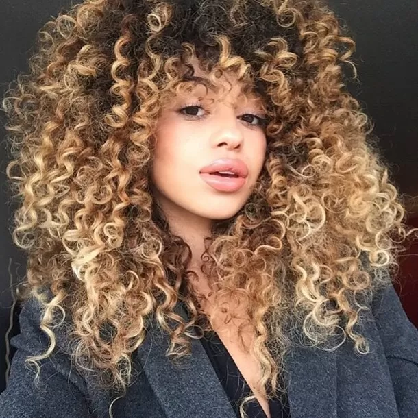 Rihanna’s long blonde stylegives off serious retro vibes thanks to its spiral curls, face framing bangs and warm, buttery shade.