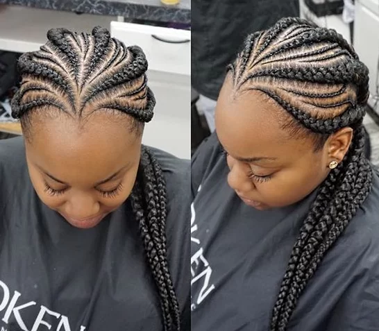 This gorgeous braid pattern combines curved Ghana braids with some skinny cornrows in between. Give this a try if you’re looking for a more unique way to wear your hair in a trendy protective style.