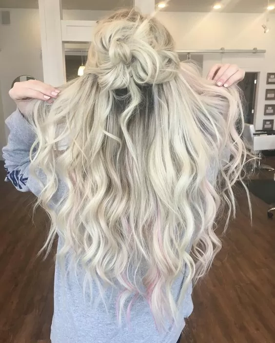 Pastel shades like blush pink are perfect for highlighting creamy blonde hair, just as this gorgeous ombre style shows. Styling the blush pink ombre into tousled, beachy waves gives this girly dye job, just the right amount of edge.