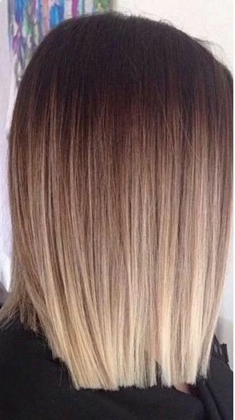 The blunt edge of this straight lob is accentuated by the white blonde at the tips. The thin, straight hair is given the illusion of texture and thickness thanks to multiple tones of blonde through an ash brown base.
