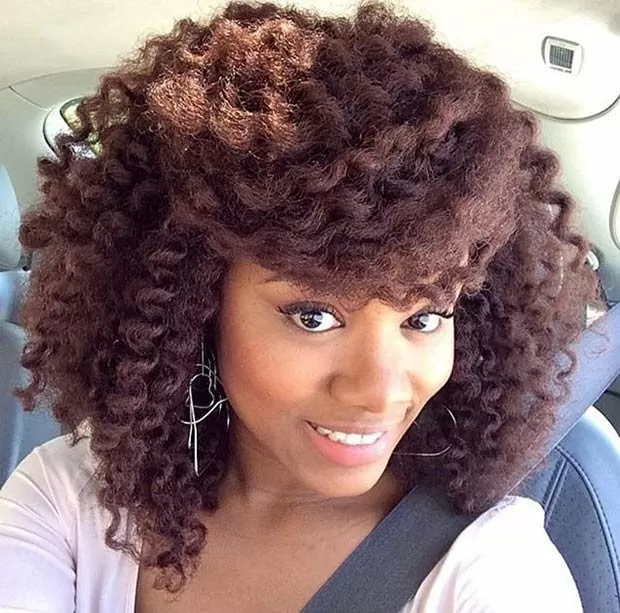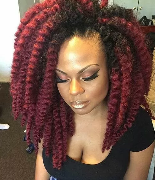 If you are going to go for color, you might as well go big. This twist out style features huge, chunky burgundy crochet braids. The look has no fear and is sure to grab the spotlight everywhere on your journey.