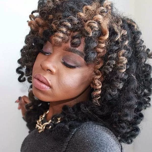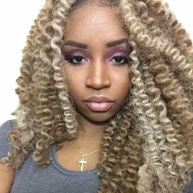 Feeling bold? Add a dash of Honey Blonde to these curly locks and all heads will turn your way. The touch of color highlights these crochet braids in just the right spot. Make sure you moisturize and condition crochet braids daily. The ends can be sealed with coconut oil.