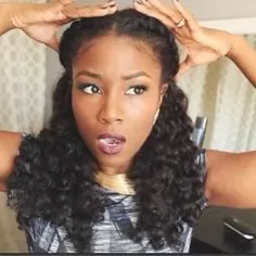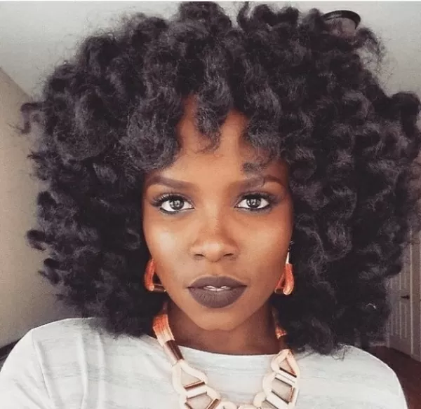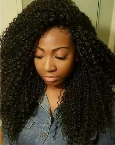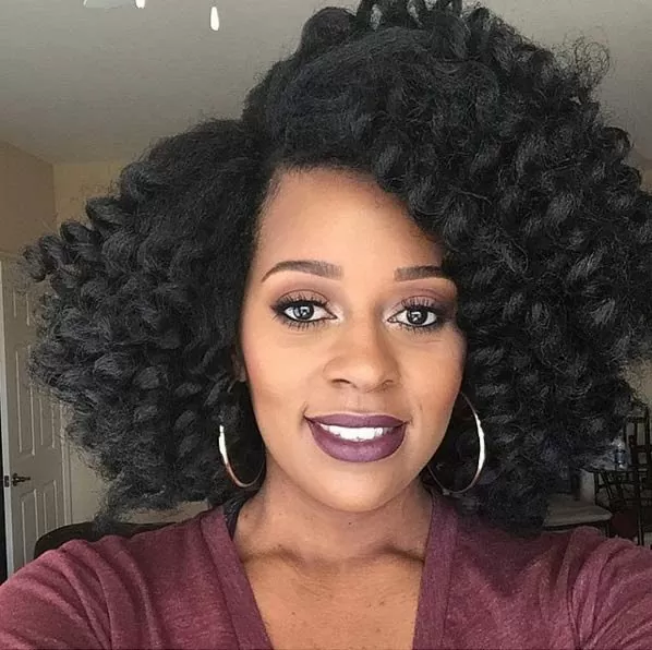 If you like a lot of volume in your curls try this layered curly crochet braid look. Ideal for long and short hair and makes it appear like you have a lot of hair. It frames the face and sets off your eyes. You may want to get your eyebrows done to complete the look.