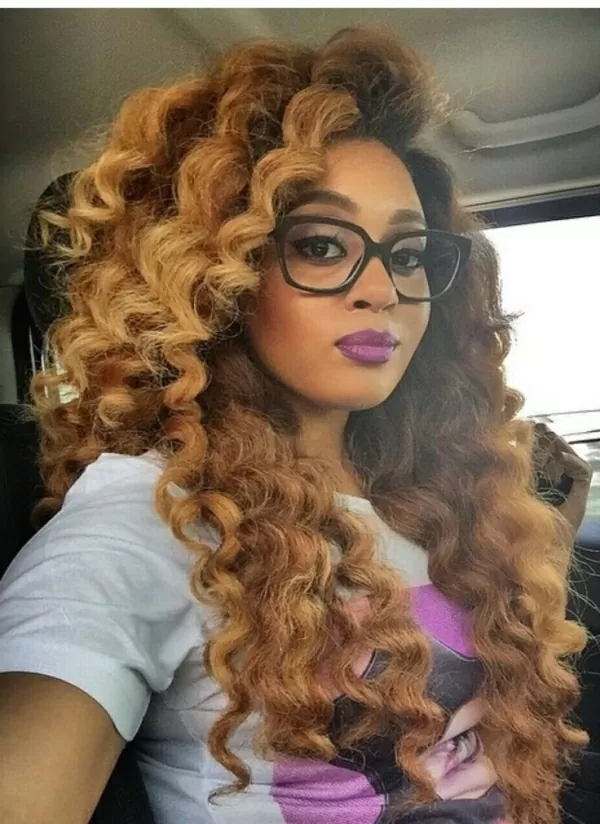Long, honey blonde loose curls stand out in the crowd in this crochet look. It’s a sassy and sexy look for a daring soul. It looks good with a business suit in the office or with a t-shirt and jeans at a basketball game.