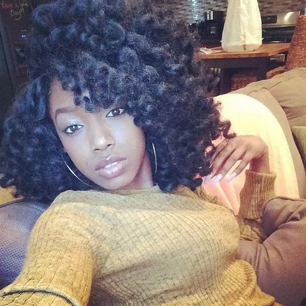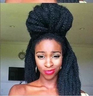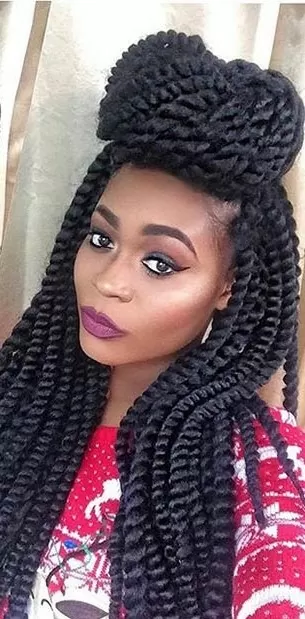 These large, crochet twists look great when piled high on the head in a bun. It adds volume to the look and is neat and simple. You can add hair cuffs or fancy hair pins to dress it up. They accentuate all facial types.