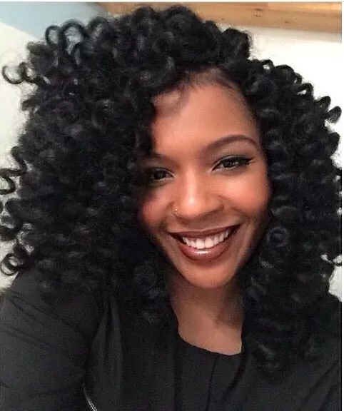 This crochet look features large spiral curls surrounding the face. It is a cute and sassy look that can go from the office to the club. The loose curls need to be moisturized to maintain their spunk. Use a silk scarf and pillowcase at night.