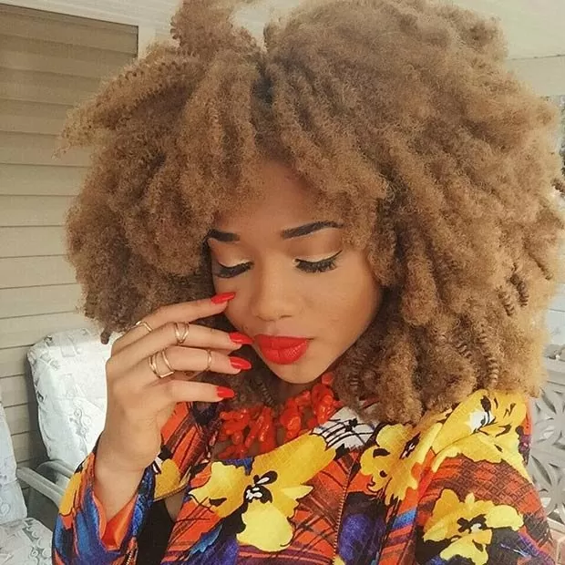 This big, colored afro is amazing. It’s simple and fantastic at the same time. You can never go wrong with a classic afro. It looks good on all hair types and once you moisturize, you know your hair will remain soft and smooth.