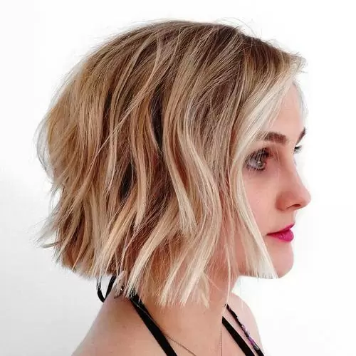 This short bob style features some layers, but not as many as the stacked bob, a style that’s best attempted by women with thicker hair. Relatively thin hair is easier to tuck behind the ears, and looks edgy and fun when cut to this length.