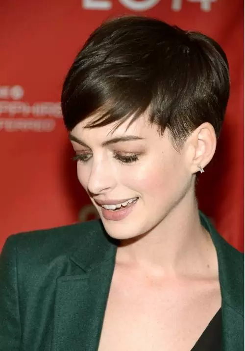 Anne Hathaway’s pixie cut is kept very short on the sides, while longer layers on top sweep softly across the brow. This may seem like a dramatic change for women who are used to wearing their hair longer, but it’s surprising how much thicker hair can appear when it’s kept in a perfectly cut pixie.