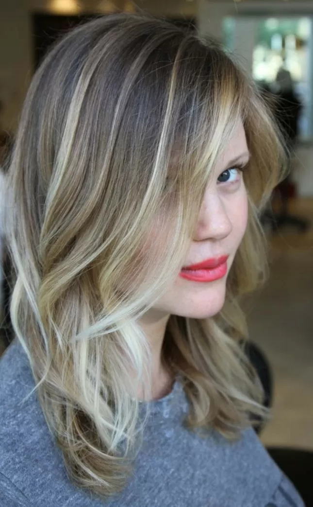 For women who aren’t a fan of the blunt look, this mid length cut features long layers that give texture at the ends without taking away from the overall volume of hair. Darker roots and highlighting that’s concentrated at the ends help to add the illusion of thick hair.