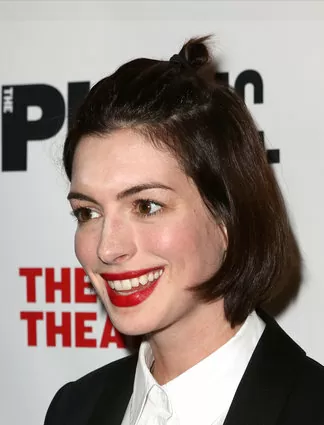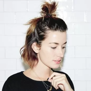 This ultra high bun is twisted into place right on top of the head, creating a style that’s somewhere in between messy and polished.