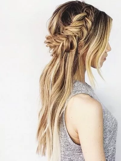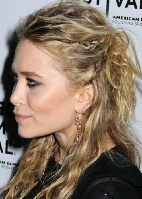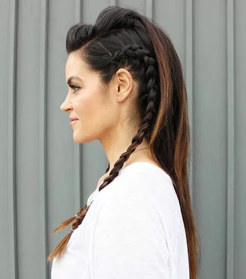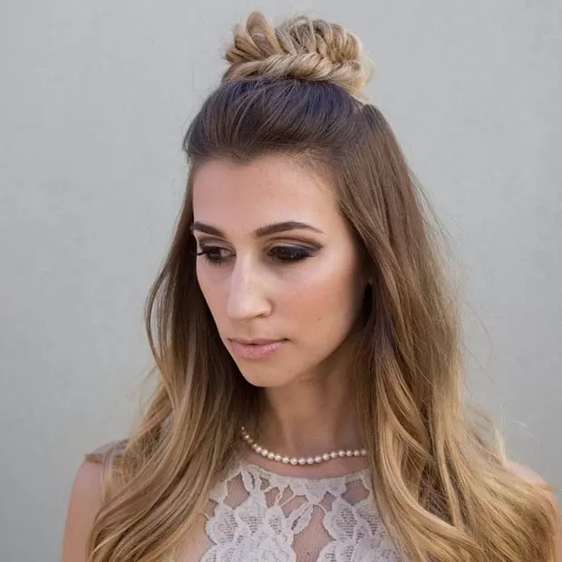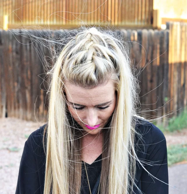 For a funky half up style that’s interesting and unique, braid a french braid on each side of your head, then style the top section into a pinned mohawk with lots of volume. Perfect for fashionistas who love feather earrings, turquoise rings, and flowy bohemian dresses.