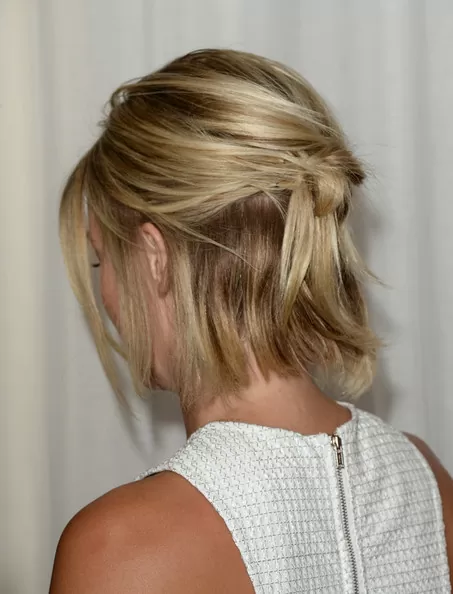 For short hair that needs a quick style fix in the morning, this folded bun is just a ponytail that isn’t pulled through all the way. This is a currently trendy style that’s perfect for days when you don’t have time to wash and style in the morning.