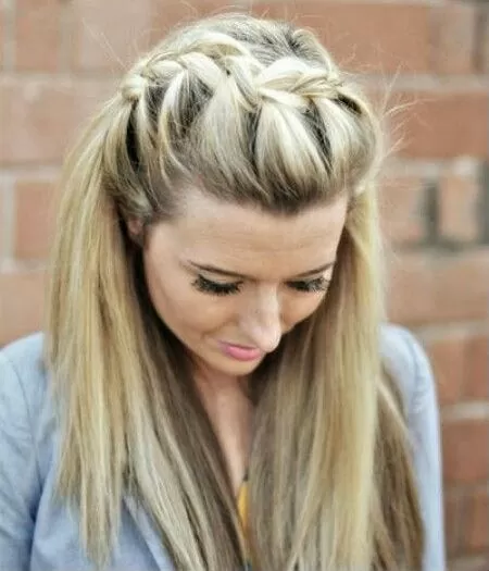 A half up style that wouldn’t look out of place on a poised beauty like Kate Middleton, this look shows off long hair while looking more sophisticated and demure than hair that’s fully down. Rather than pulling half of hair into a plain ponytail, this style pins back sections from each side of the part, and features a subtle rolled style on the larger section, adding volume that creates a crown effect.