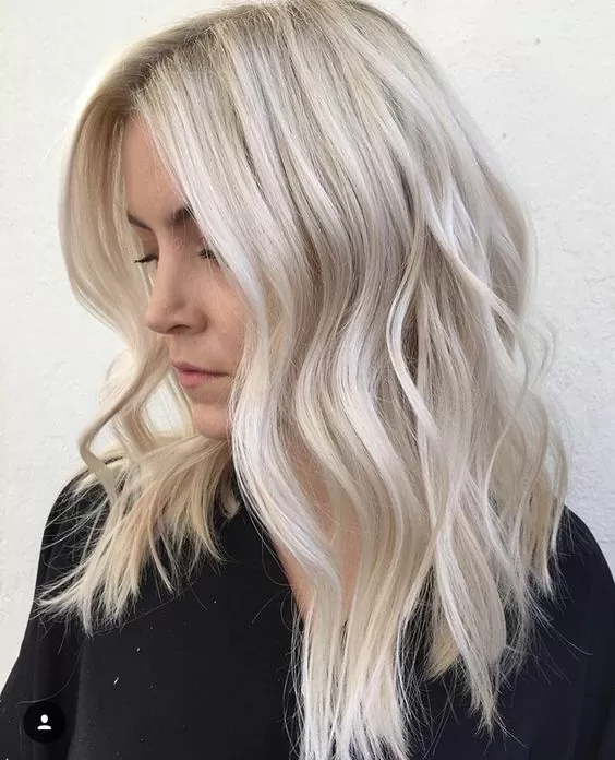 These lovely relaxed waves are so carefree and effortless and the bright icy blonde shade perfectly complements the model’s peachy skin tone. The dark roots helps to create the illusion of extra volume and depth at the roots.
