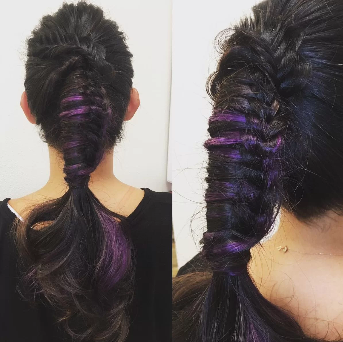 This fancy ladder braid ponytail has been combined with a fishtail braid to create an intricate mermaid inspired style. Tie hair into a mid-height ponytail, leaving one section at the front of the head loose. Braid the loose section into a fishtail braid, then wrap around the base of the ponytail. Next, create a ladder braid on your ponytail, stopping partway down and finishing by wrapping hair around your ponytail.