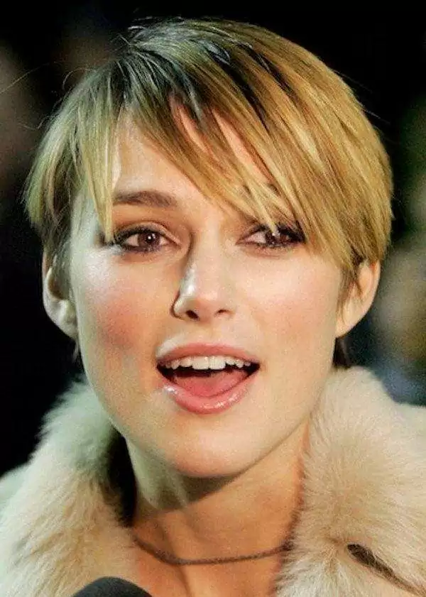 Keira Knightley’s short hair here is worn in a fairly boy-inspired style that sweeps long straight pieces across the forehead. Try this cut if you’re trying to camouflage a larger forehead or balance out a heart shaped face.