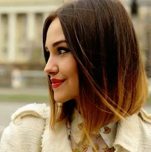 Blending auburn roots into lighter strawberry blonde ends, this is a perfect transitional colour for women with fair complexions. As for the cut, this lob with long layers is one of the trendiest looks around, in addition to being easy to style and maintain.